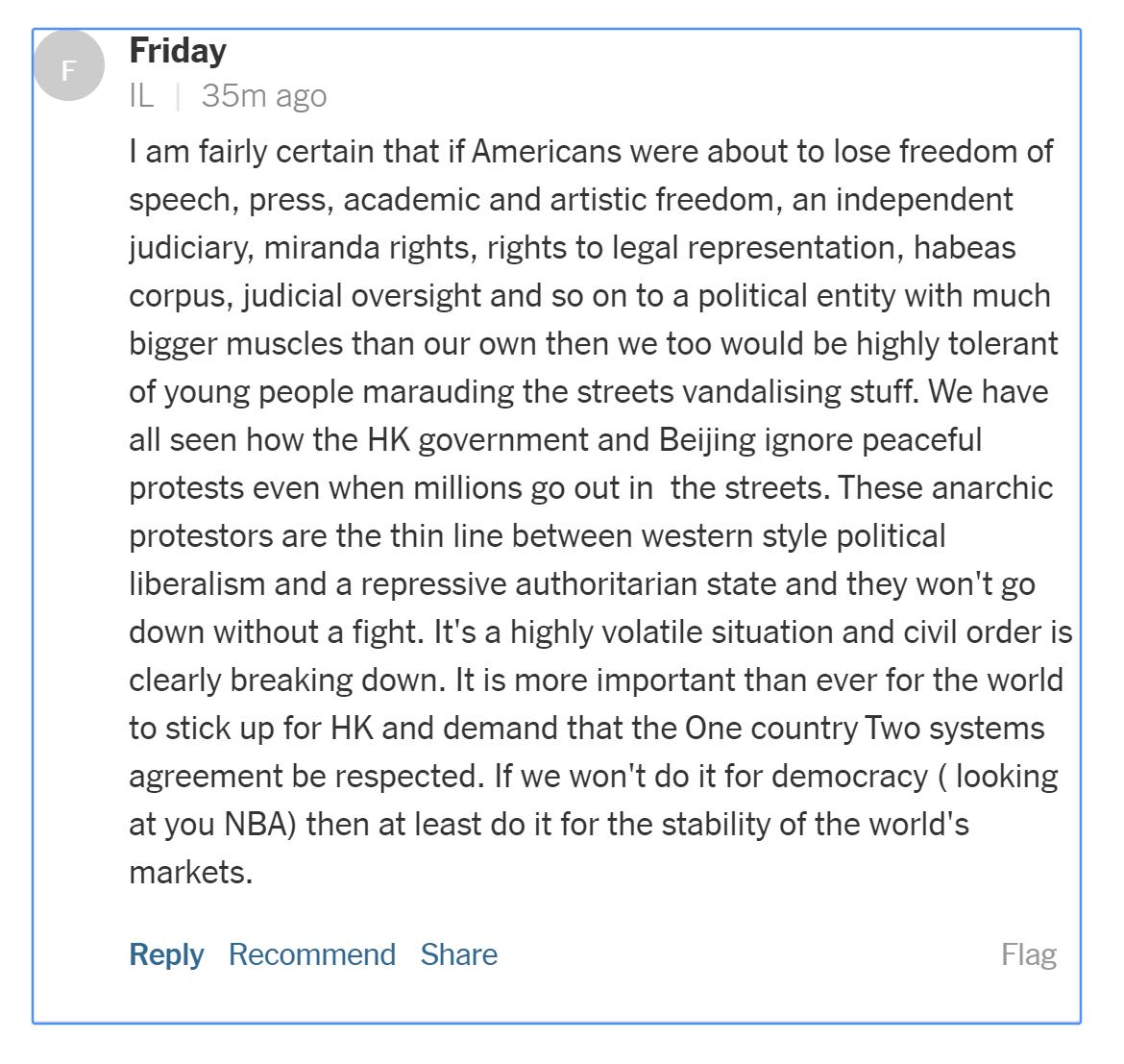 "The protesters have also begun setting more and more street blazes, which send plumes of black smoke swirling through Hong Kong’s urban canyons" and which firefighters put out within minutes, allowed past barricades with cheers by the crowd, this Pulitzer-seeker forgot to add.