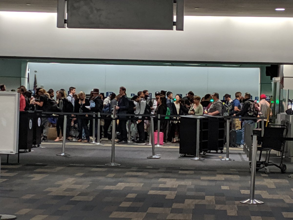 Line of US citizens waiting to get in at SFO. Involves interacting with two human herders, a kiosk, and then a single border agent on duty (his colleague is in her booth but not accepting non-CLEAR citizens. Scientology?)pic.twitter.com/0qKC5qE75b