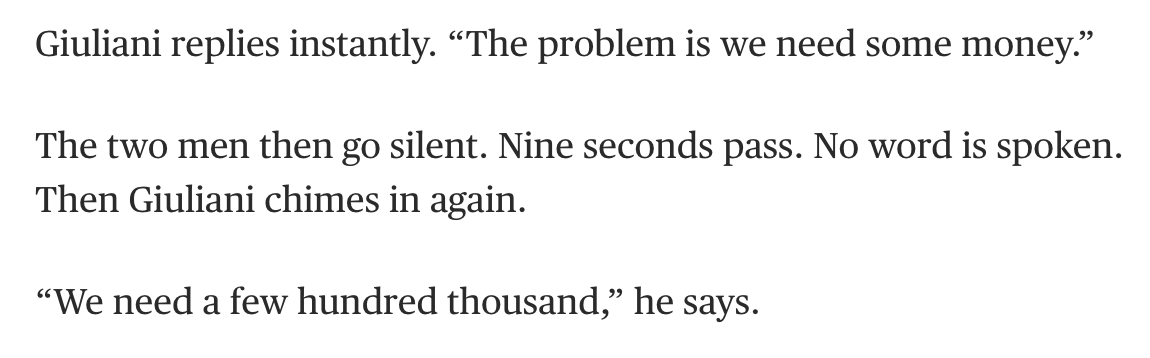 My favorite thing about this alleged Rudy Guiliani butt dial is that it's highly exculpatory. Can't tell whether the whole episode is 12-dimensional chess or Connect One https://www.nbcnews.com/politics/politics-news/rudy-giuliani-butt-dials-nbc-reporter-heard-discussing-need-cash-n1071901 …