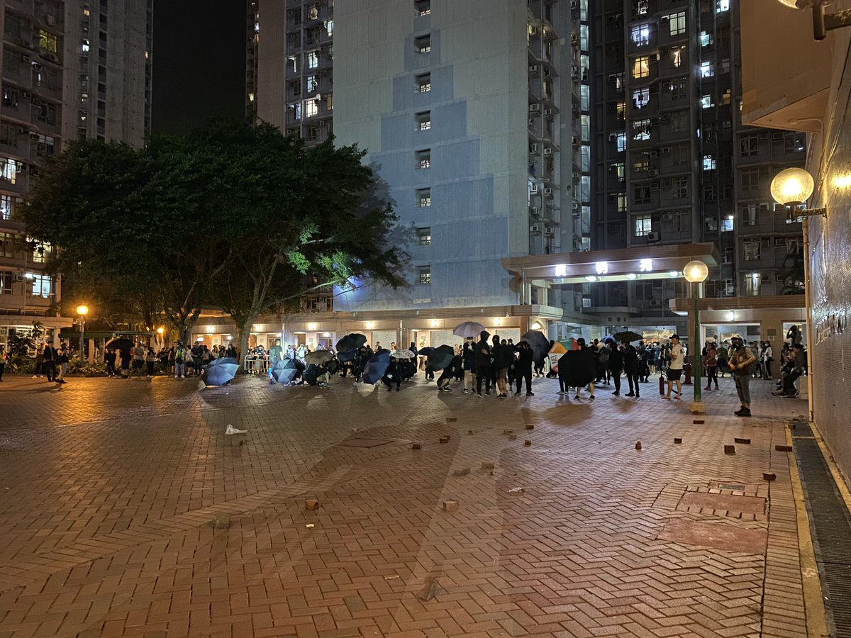 About 100 riot police are on the ground of Kwong Ming Court TKO after reinforcement arrived. Protesters behind the umbrella hurled a round of glass bottles onto the area in front of them. Police shouting warning repeatedly. Residents out there are defiant and angry.pic.twitter.com/ir5jVgkmNq