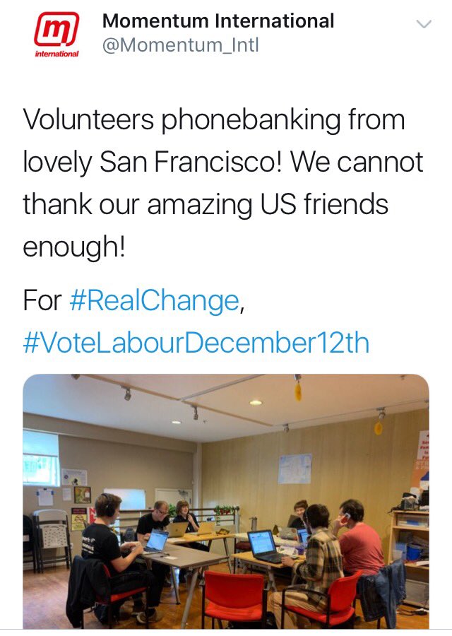 San Francisco's DSA is doing (a couple hours of) phone banking for Labour in UK elections. That's right: an American political org is phonebanking in a U.K. election from San Francisco! Wondering who's going to phonebank from overseas in our elections next year.pic.twitter.com/hbacnLA81e