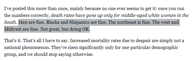 I mean, you can maybe say TOTAL MORTALITY RATES have the pattern in the chart, but that obviously doesn't imply that "deaths of despair are only rising for White women in the South".pic.twitter.com/VWUGlseN5Y