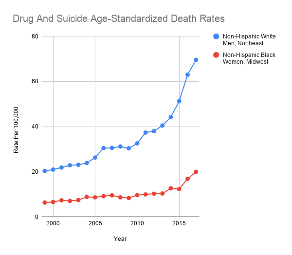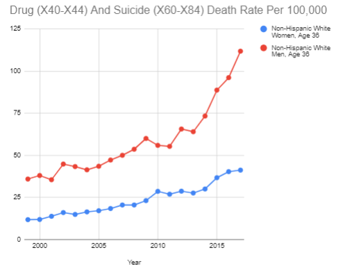 (That's just from CDC Wonder dividing by gender/race/age/Hispanic origin/region, causes X40-X44 for drugs and X60-X84 for "intentional self-harm". I know you can age-adjust more finely but like.)