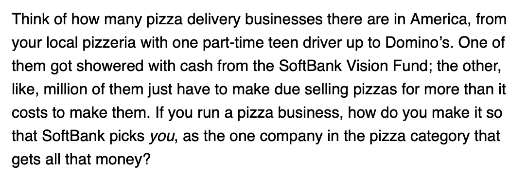 Matt Levine has a funny writeup today of a SoftBank-funded pizza delivery chain that failed after a $375M investment. But this is the dynamic killing innovation in tech. Imagine if you were the one for-profit pizzeria in an environment where everyone else gets stupid moneypic.twitter.com/iA9uL2C5xK