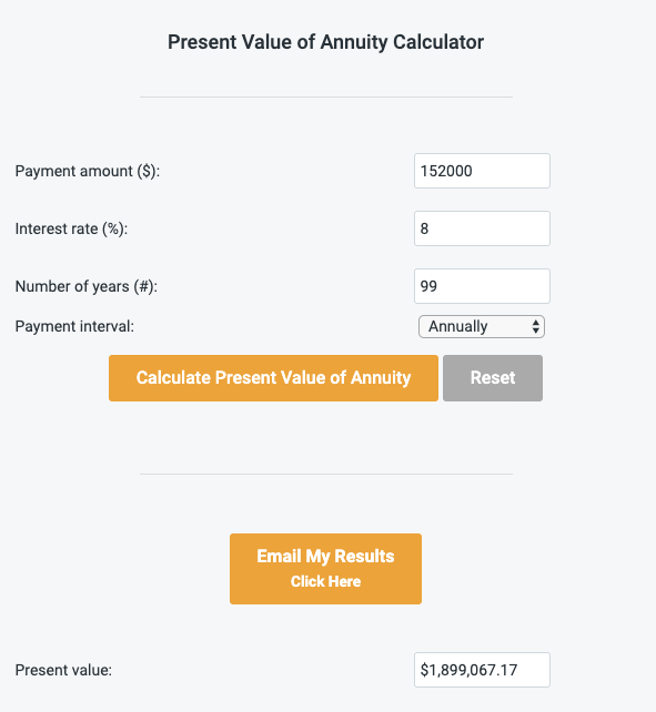 if you made the (very tenuous) assumption that the 152k in gross cash flow was equivalent to an annuity payment, and use the average return of the stock market as the interest rate (opportunity cost assumption), i might say $1.9Mpic.twitter.com/NlIzJrHTuT