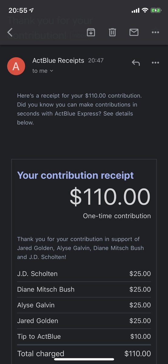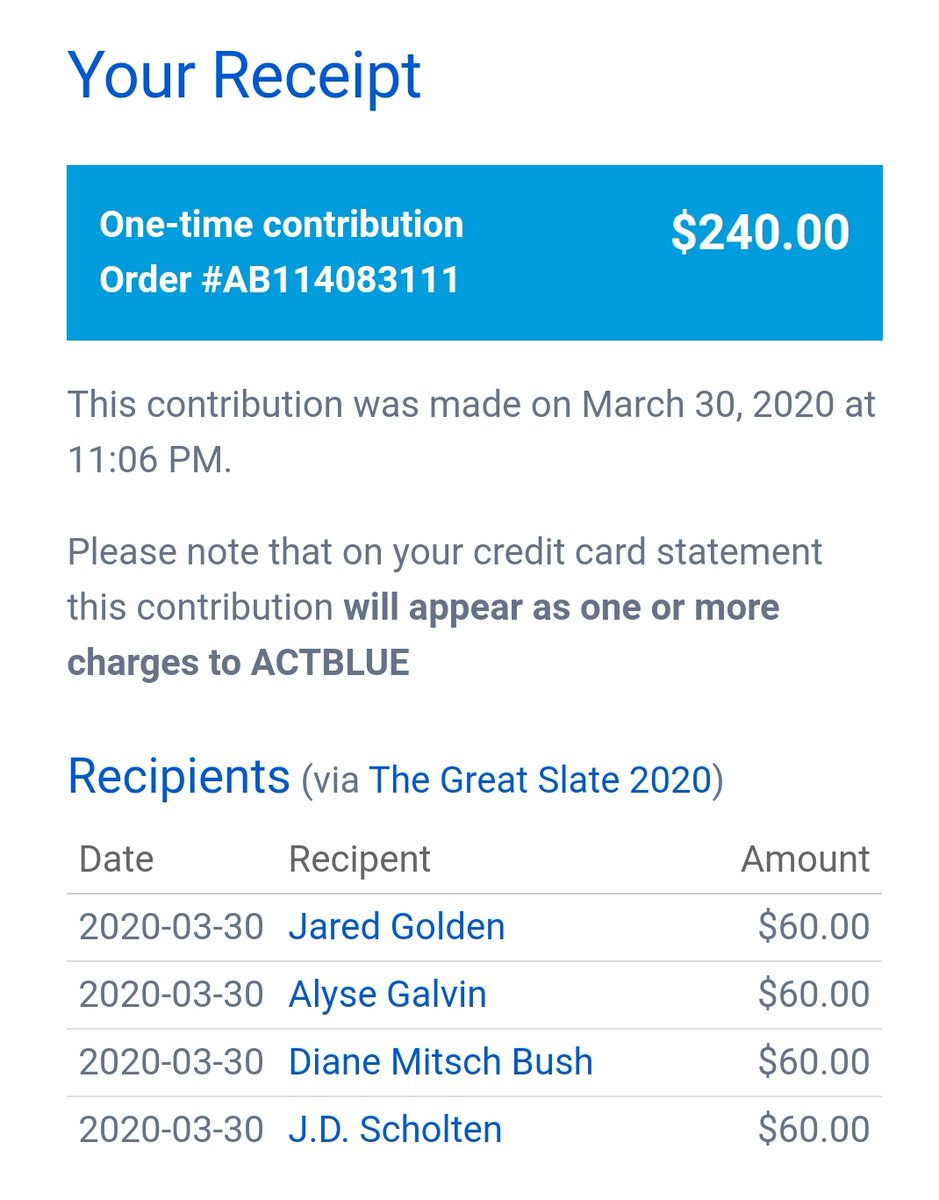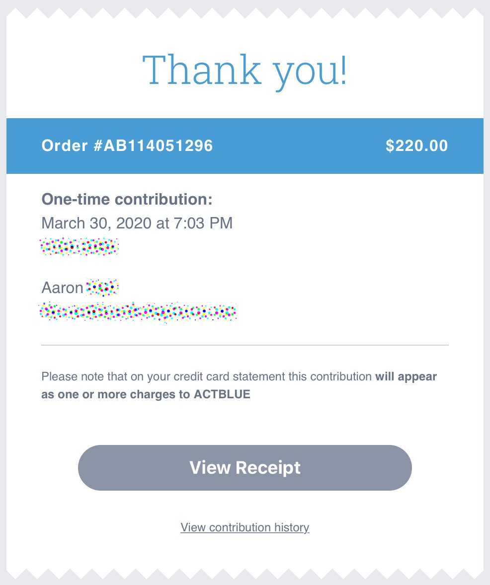 Remember, you don't need to give ActBlue your real email or phone number. All you need to give is the Federally required stuff (employer, name). I have collected blood oaths from campaigns not to share data, plus have done my best in ActBlue settings to turn email collection off.