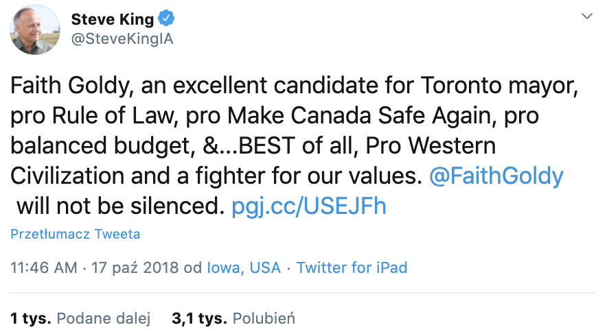 In October of 2018, King came out in support of Canadian fringe right political figure Faith Goldy, who did an interview with the neo-Nazi website the Daily Stormer, and was eventually banned from Facebook for advocating extremist views.pic.twitter.com/8usBmGzSjm
