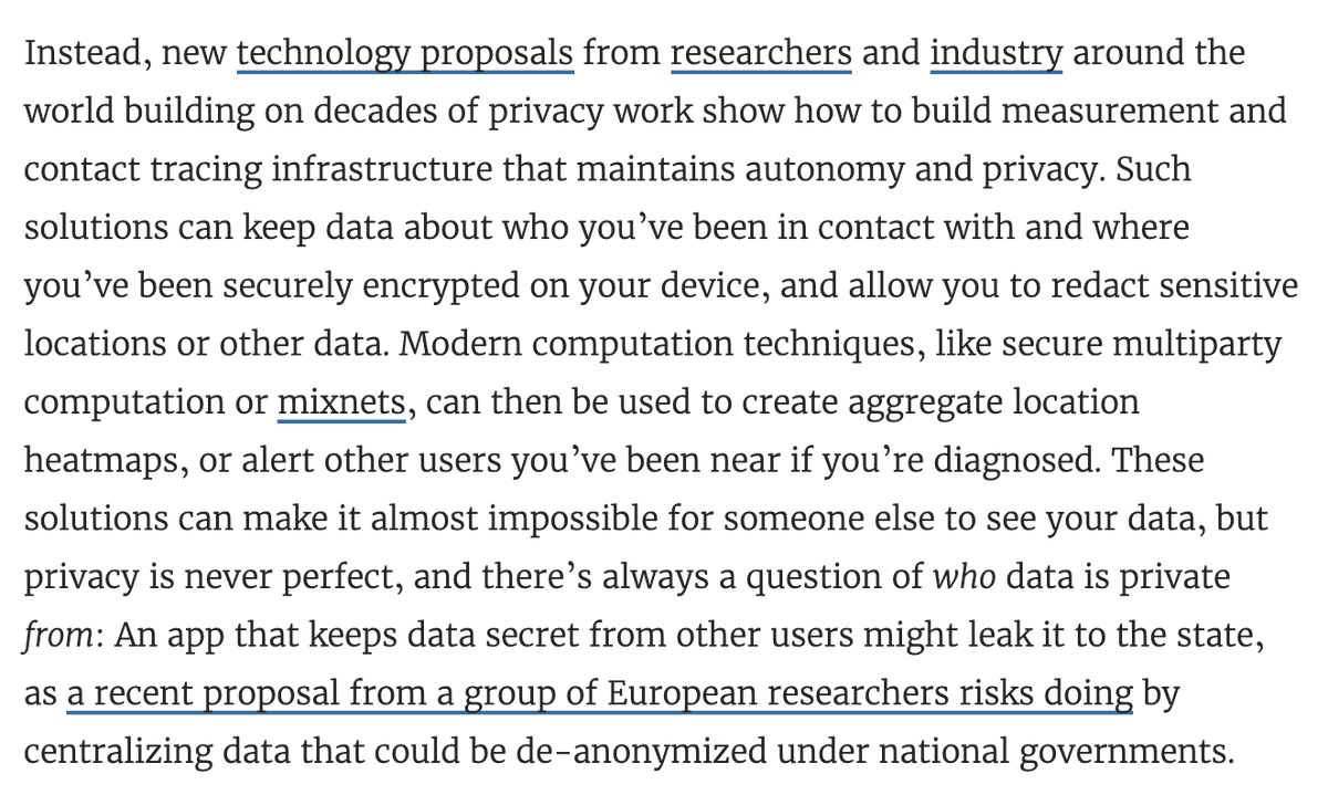 and most of them do not even consider privacy, because why would they? my big take-away is that if we can use this shock-doctrine moment to argue for solutions that build a more private future instead of a surveillance state, we should, full stop.