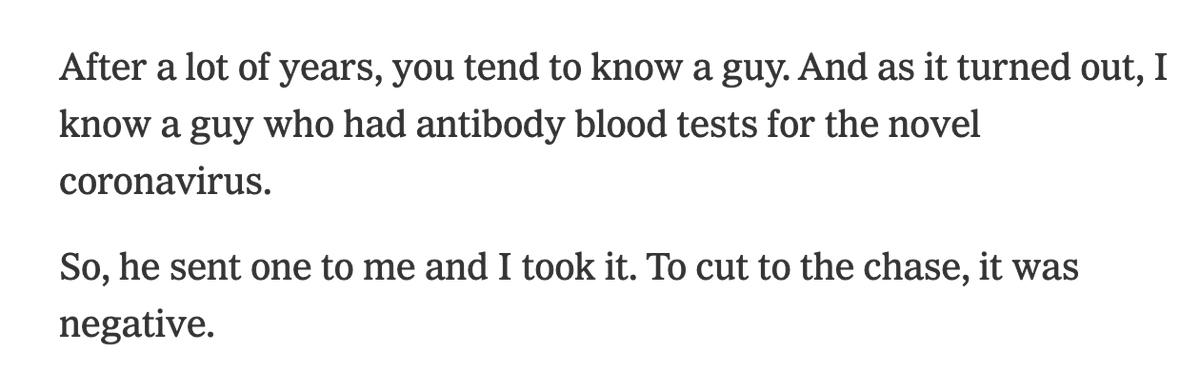 This Kara Swisher column consists of a boast that she was able to score a black market antibody test, a complaint about being sick back in January, and the conclusion that we don't have enough tests. That's the entire content of her essay. (Face-touching thumbnail is a bonus)pic.twitter.com/NsmlTnTGsz