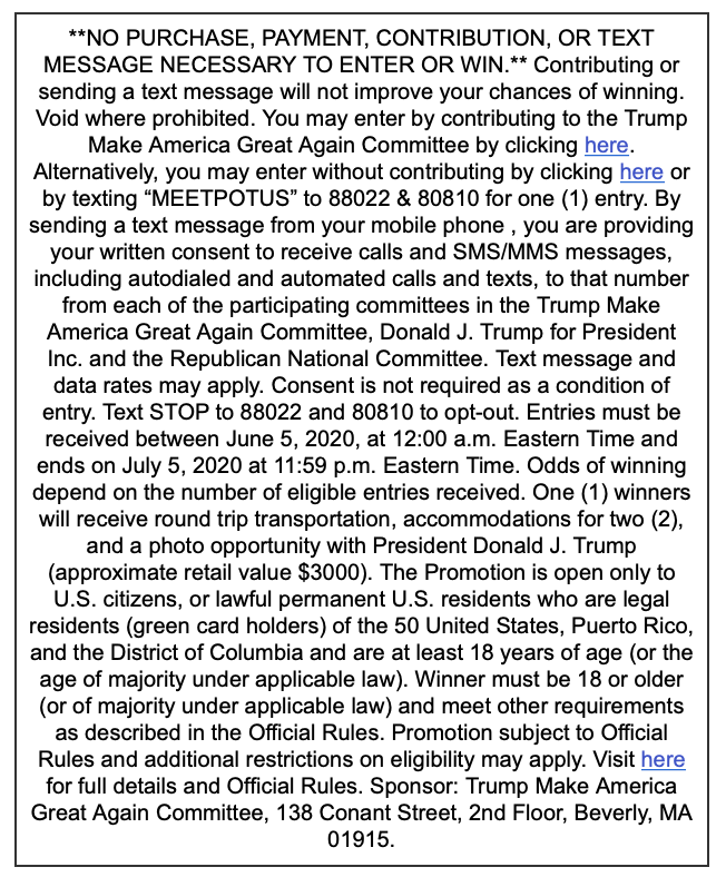 Dear Federal law Twitter: I believe this solicitation by the Trump campaign offering a luxury trip to meet the candidate as a raffle to contributors may be illegal. Am I wrong?pic.twitter.com/oC3FvQD7hX