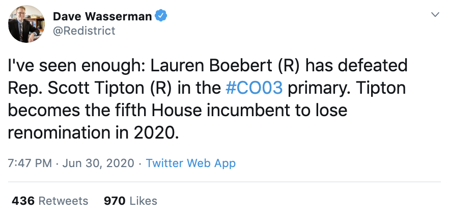 We have great news out of Colorado's third district—the Great Slate's @RepDMB has comfortably won her primary! But the even bigger news is that her incumbent Republican opponent, Scott Tipton, is losing the primary right now to a right-wing extremist