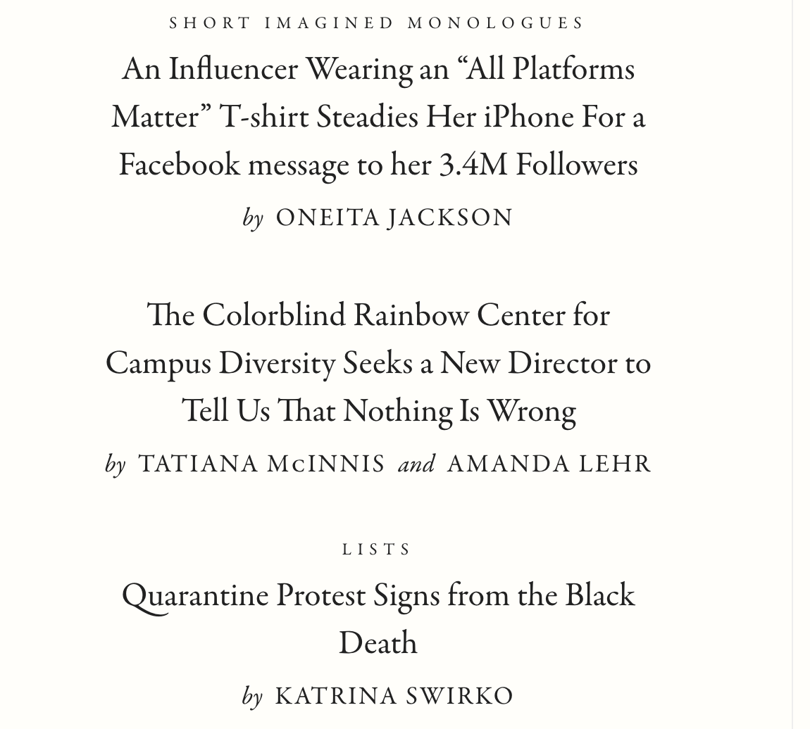 McSweeney's's foray into this brand of solemnity is the funhouse mirror version of that awful New Yorker humor column.pic.twitter.com/Z1k5rarCRP