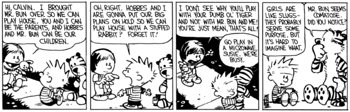 It wouldn’t be in the spirit of the original strip, but I wouldn’t mind eavesdropping on Mr. Bun and Hobbes as they compare notes on their imaginary friends.pic.twitter.com/3VVBX6BDyx
