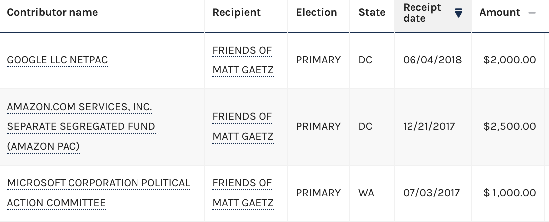 A reminder that if you work at Google, Microsoft, or Amazon, your employer gave money to this numbnuts in your name. https://twitter.com/RepMattGaetz/status/1282320656500174848 …pic.twitter.com/YUr0riHr78