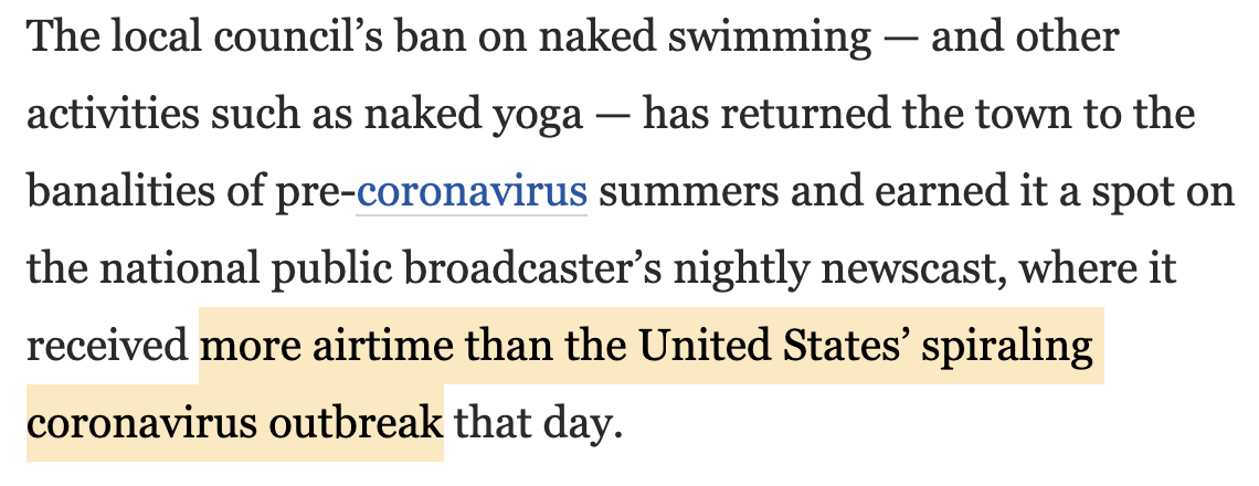 I am loving this catty Washington Post article about European countries that have the pandemic under control not wanting to talk about it 24/7, and preferring to focus on non-pandemic-related topics like public nudity.pic.twitter.com/sVL1912aGp