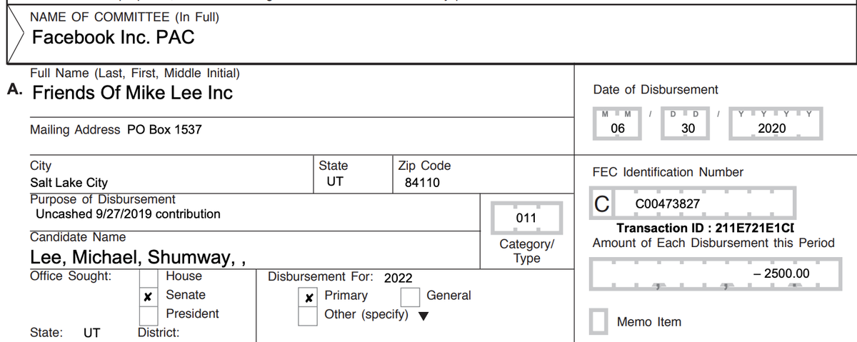 Pretty funny detail from Facebook's latest FEC filing. The company tried to give money to Mike Lee and to Mike Crapo's leadership PAC in 2019, but neither campaign cashed the check. It's rough out there when even Republicans won't take your money.pic.twitter.com/4ND9ddrDV4