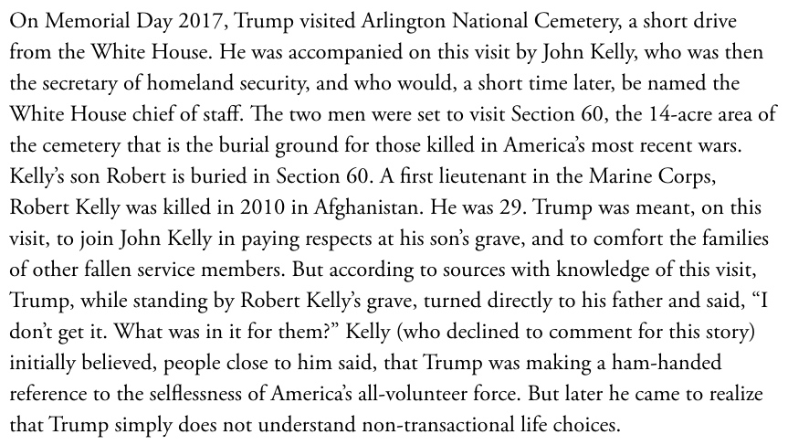 “Kelly ... initially believed, people close to him said, that Trump was making a ham-handed reference to the selflessness of America’s all-volunteer force. But later he came to realize that Trump simply does not understand non-transactional life choices.“ pic.twitter.com/n1GDw7NRLu
