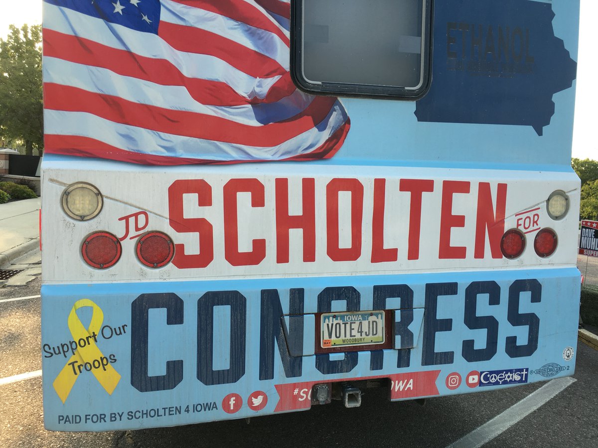 Headed out this morning to Boone, IA, to follow J.D. Scholten on a long campaign day through Iowa's fourth district—Steve King's district—where the Iowa Senate race will be decided. Scholten is halfway his promise to visit every town, and smash every bug in Iowa with his R.V.pic.twitter.com/YypwBVmZXJ