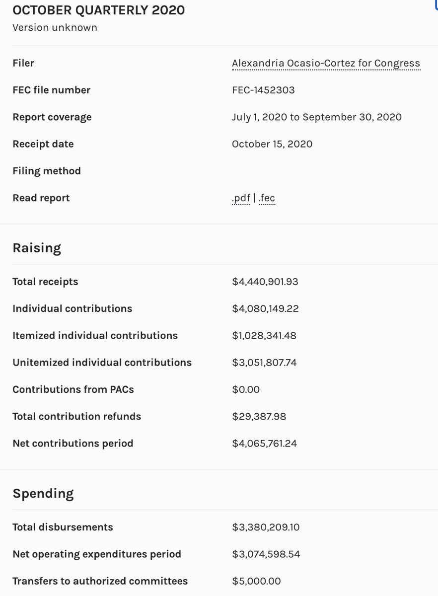 Alexandria Ocasio-Cortez raised $4.44 million and spent $3.38 million in the third quarter of 2020, for no discernible purpose. The great Wheel of Fundraising must turn.pic.twitter.com/k3U0v6h9uU