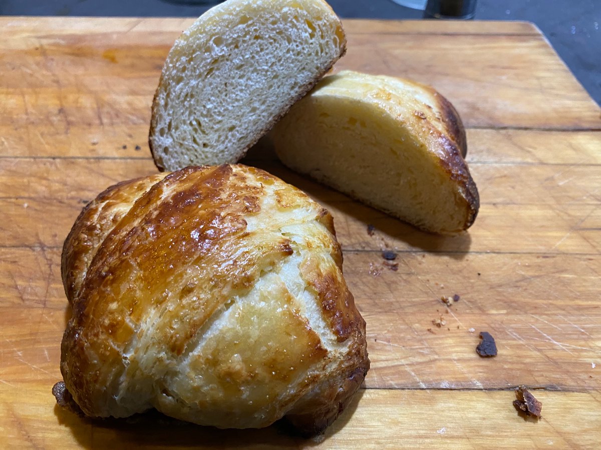 Four mistakes I made: 1. Attempting to make croissants and thus tempting fate. 2. Rolling sheeted dough too hard, rather than “gently stretching”. 3. Used White Lily (it’s what I had), a soft flour. 4. Didn’t proof before folding in the butter square. I blame Hollywood.