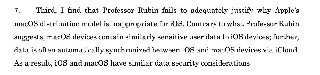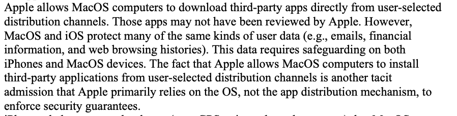 Epic's experts also like to claim that macOS allowing any code to run is proof that it is fine for iOS to allow any code to run. This post my @matthew_d_green is a good introduction for civilians that explains why your iPhone is safer than your Mac: https://blog.cryptographyengineering.com/2017/03/05/secure-computing-for-journalists/ …pic.twitter.com/E8UScBq6OZ