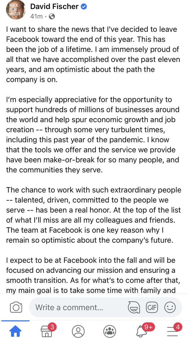 New: Facebook’s Chief Revenue Officer David Fischer posted that he’s leaving the company later this year. He’s been there more than a decade, reports to Sheryl Sandberg and oversees Facebook’s sales and Ads. A notable departure pic.twitter.com/Ju6pv9gtYA