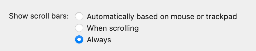 System Preferences > General > Show Scroll Bars > Always