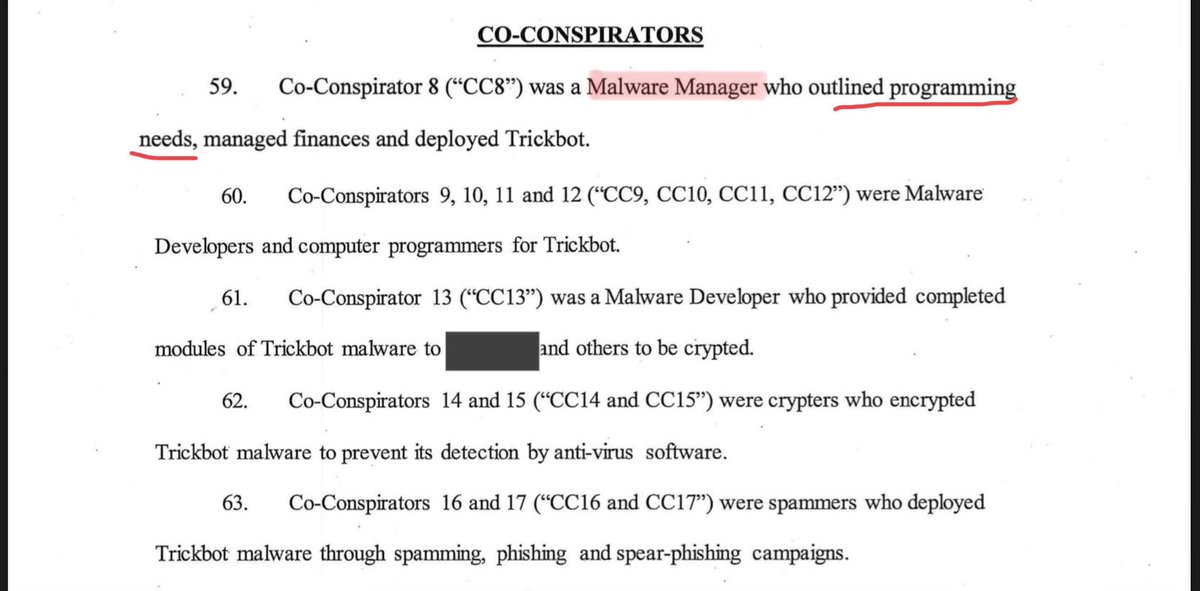 I love malware indictments. They provide so much insight into the organisation and day to day operations of ransomware groups. Trickbot has three managers, including a PM and a VP operations.pic.twitter.com/XDr1nLjyFJ