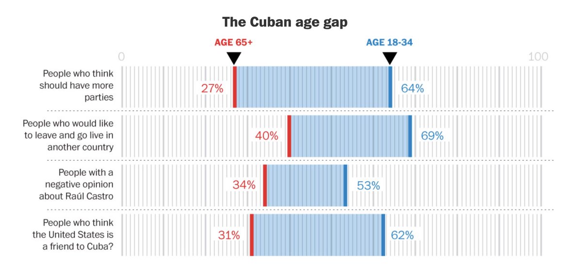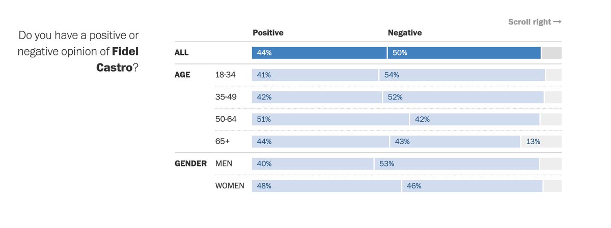 This is the only reputable poll (from 2015) I'm aware of from Cuba: Fidel: -6 Raul: -1 Communist party of Cuba: -26 Multi-party elections: +24 Large generational divides on attitudes toward the regime, but not on opinion toward Raul and Fidel Castro. https://www.washingtonpost.com/graphics/world/cuba-poll-2015/ …pic.twitter.com/MgEou1O7au