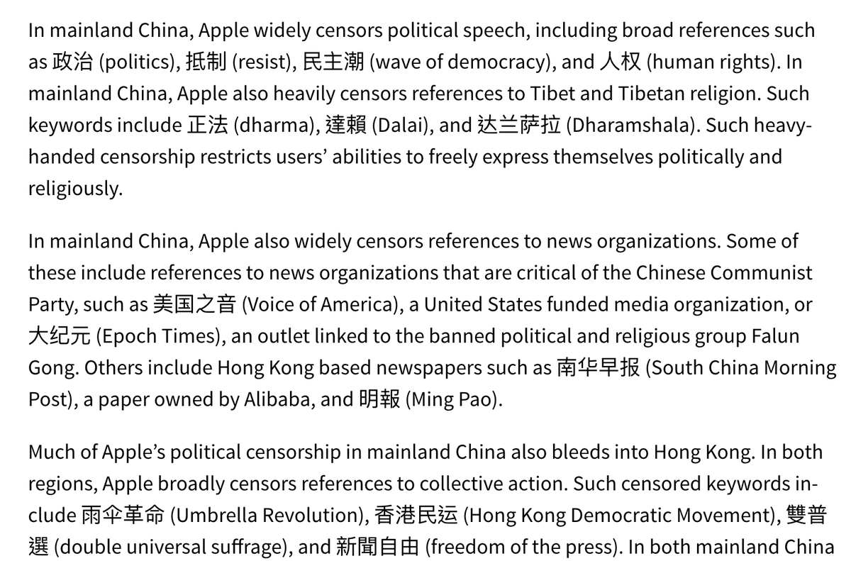 Fascinating article analyzing Apple's blocklist for what you can engrave on their devices. It implies the existence of a group within Apple responsible for creating and gardening a list of political terms the Chinese government might find objectionable. https://citizenlab.ca/2021/08/engrave-danger-an-analysis-of-apple-engraving-censorship-across-six-regions/ …pic.twitter.com/ZqCOuSmcdJ