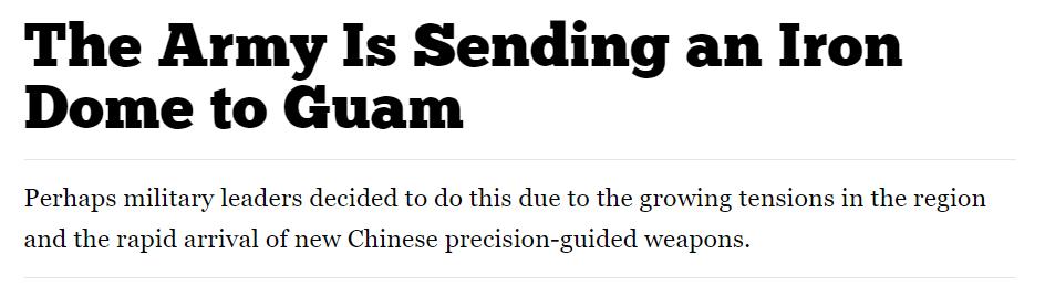 So, here's the thing: Iron Dome is absolutely and utterly incapable of handling any realistic missile threats to Guam. Unless the PLAN has mermen armed with mortars/short-range rockets that we don't know about.