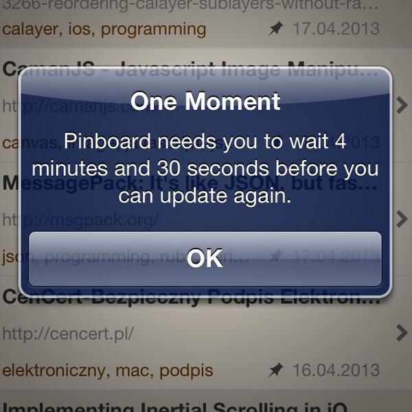 @krzyzanowskim it's API rate limiting. But no app should need to make multiple requests to posts/all, have the dev contact me