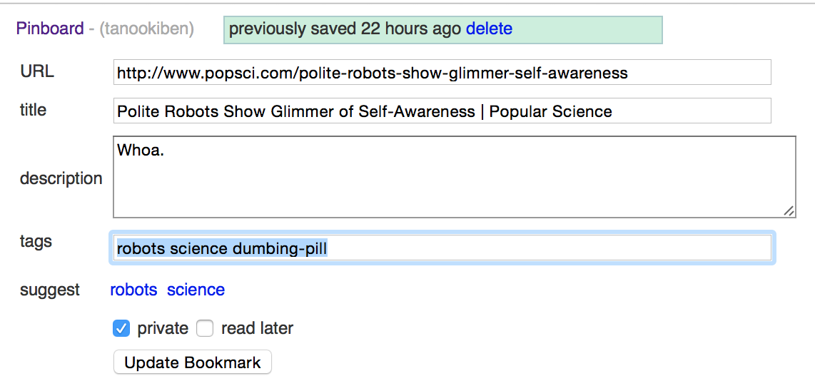 Do not attempt to compete with Pinboard. http://pinboard.in  maciej@ceglowski.com +1 415 610 0231
