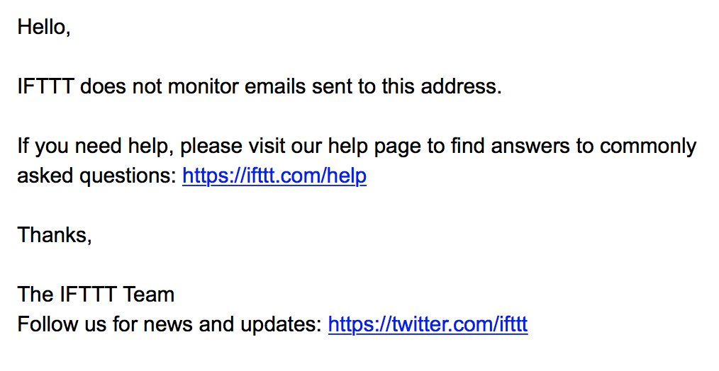 @voxpuibr Thanks for flagging this. That’s a bug. We’ll fix the no-reply address. You can always contact us at support+viatwitter@ifttt.com.