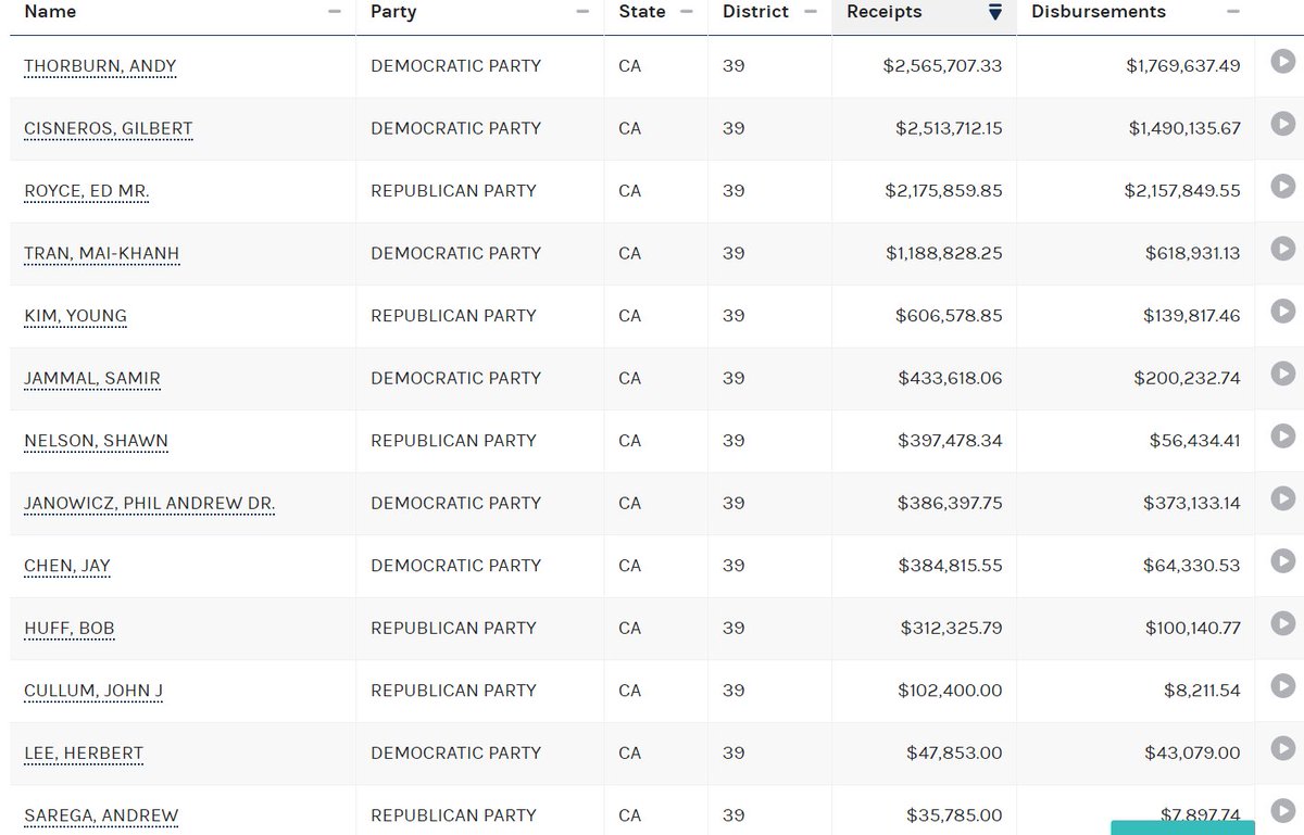 And here's CA-39, again, Royce isn't running anymore, so you have six Democrats and three Republicans who raised at least $300,000. Again, you'd need two of those Republicans to beat ALL SIX Democrats. No idea how likely that is.pic.twitter.com/hlDbzdg6BQ
