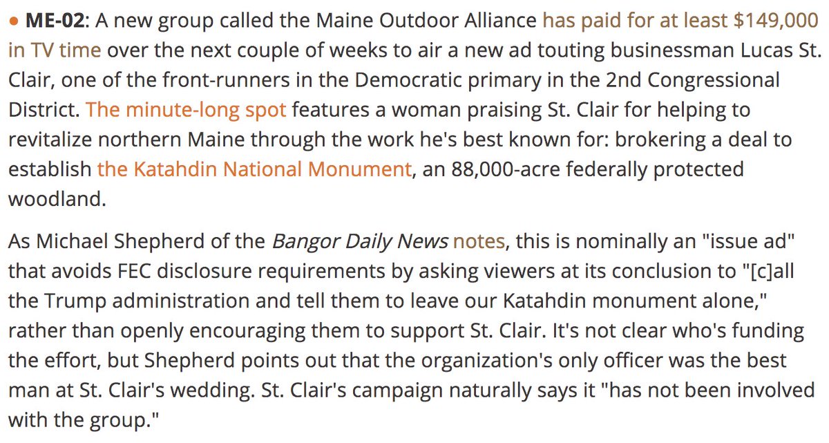 A great example of dark money in action from Maine's 2nd district, where Lucas St. Clair's millionaire mom appears to be funneling money into thinly disguised "issue ads" through a front group. St Clair's rival, the Great Slate's Jared Golden, is relying on dork money to counter.pic.twitter.com/9lWZkKo1R5