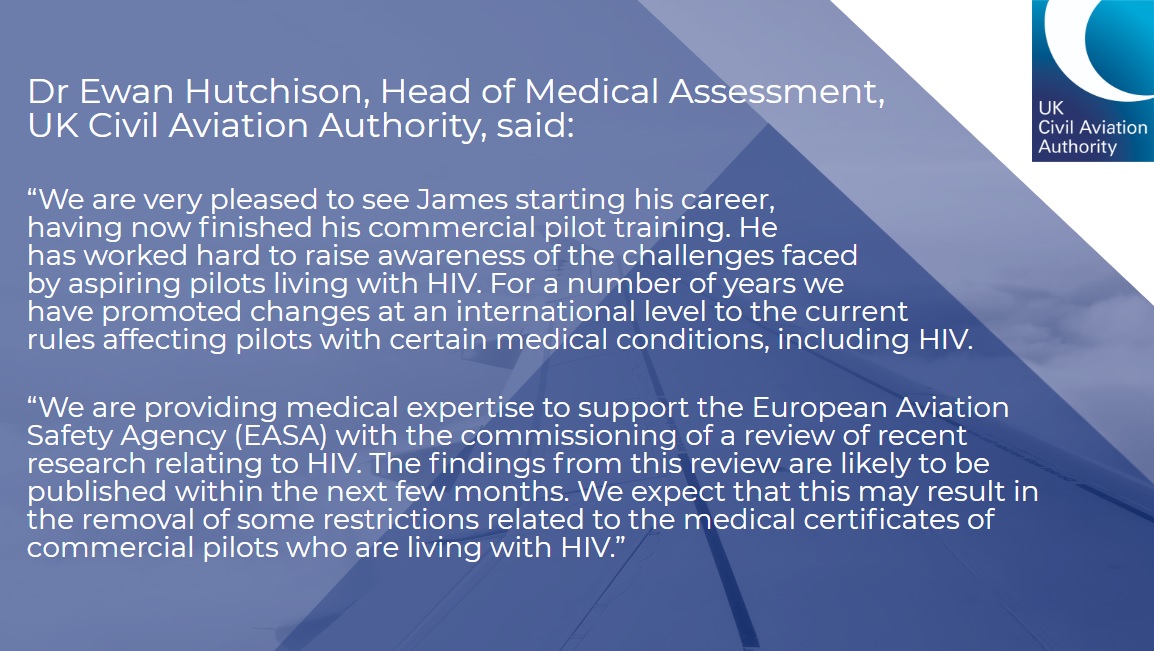 We are very pleased to see James Bushe starting his career, having now finished his commercial pilot training. He has worked hard to raise awareness of the challenges faced by aspiring pilots living with HIV. See our full statement below.pic.twitter.com/2qeNpHSwm5