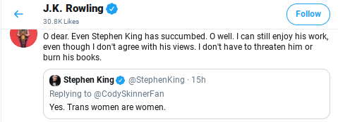 I have much greater respect for Stephen King today and quite a bit less for J.K. Rowling. #translivesmatter #LGBTQ #Pride #LoveWins