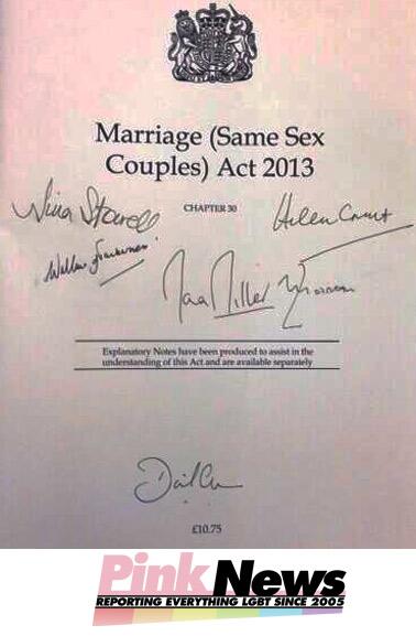 Here's the Marriage (Same Sex Couples) Act signed by @David_Cameron, @tinastowell, @Maria_MillerMP & @HelenGrantMPpic.twitter.com/YkBXstADuK