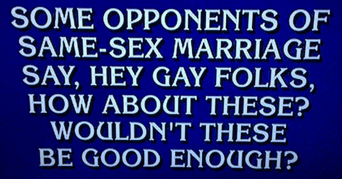 Jeopardy! pokes fun at opponents of same-sex marriage http://p.ink.cx/15ribVF pic.twitter.com/bUgvdTVirt