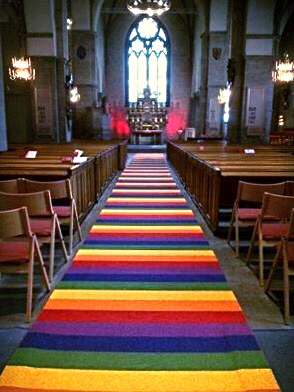 This is a church in Örebro, Sweden. And yes, that is a rainbow carpet in the aisle! :)
