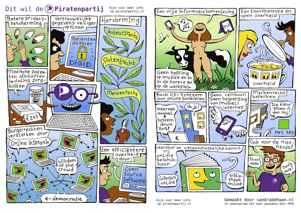 We hebben een lang programma: https://wiki.piratenpartij.nl/tk2021:partijprogramma … Een kort programma: https://wiki.piratenpartij.nl/tk2021:kortprogramma … En eentje in stripvorm!