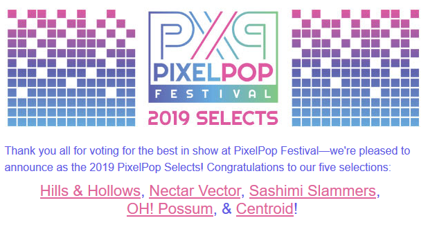 @PixelPopFest Select! Congrats to the other amazing games who were also selected@OverHookGames (Hills & Hollows),@NectarVecGame (Nectar Vector),@tamsencreed (Oh! Possum) & Centroid!!!
