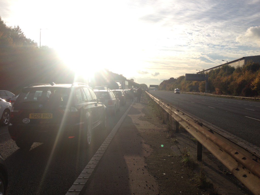 Stuck on the M56. Roads closed in both directions. Haven't had lunch yet, rip stomach