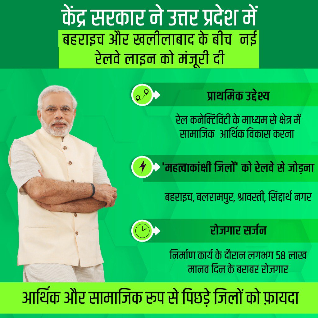 सरकार ने आज बहराइच-खलीलाबाद के बीच लगभग 240 KM की नई रेलवे लाइन को मंजूरी दी, यह रेल लाइन उत्तर प्रदेश के 5 मुख्य जिलों को जोड़ेगी, श्रद्धालुओं के लिए लाभप्रद होने के साथ साथ प्रदेश में लगभग 58 लाख मानव दिवस का रोजगार सृजन होगा #NayiPatriNayiRaftaar http://www.pib.nic.in/PressReleaseIframePage.aspx?PRID=1550478 …pic.twitter.com/bdJI5s2VYx