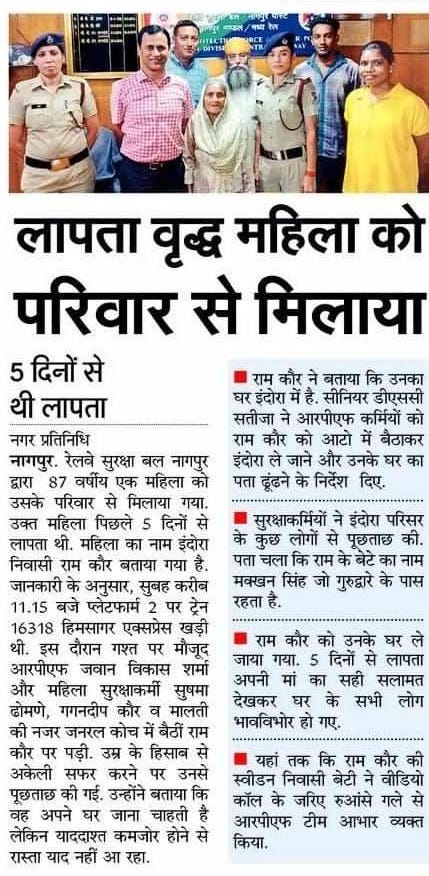 Sir, This is commendable job by RPF,whose best efforts and great service connected back 87 yrs old lady with her family.With your leadership Indian railways is getting better & better in all parameters.We applaud you for your efforts & dedication.