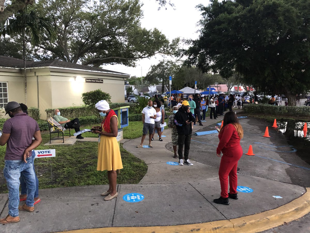 About 50 people in line outside the North Miami library voting site, where people vote in the Desiline Victor wing — named after a 102-year-old woman who waited in line three hours to vote for @BarackObama in 2012.pic.twitter.com/kioeCt8STF