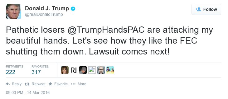 @TrumpHandsPAC @realDonaldTrump if he sued, he'd have to have his hands measured to prove who's right. we know he would never do that
