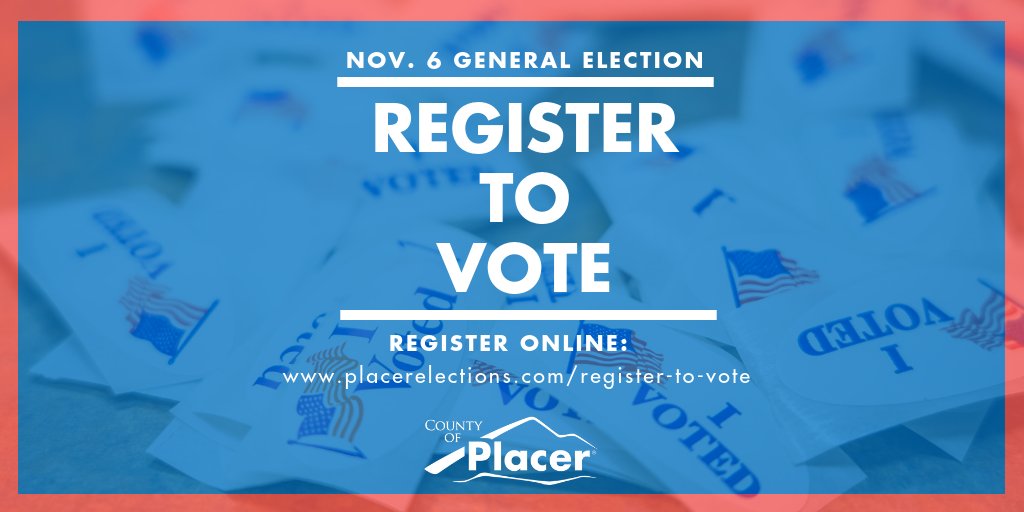 Be part of our democratic process: Register to vote for the Nov. 6 #GeneralElection. Visit our Elections Office website to register to vote, find your polling location, learn how to vote by mail and check your mail ballot status. Learn more: http://placerelections.com/register-to-vote/ …pic.twitter.com/6upC2Ls2hp