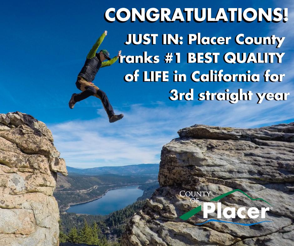 We're excited to announce Placer County has once again been ranked #1 for having the best quality of life in California. The 2019 rankings were released by County Health Rankings and Roadmaps. San Mateo and Santa Clara were ranked second and third respectively.pic.twitter.com/DJPPxJ8lku